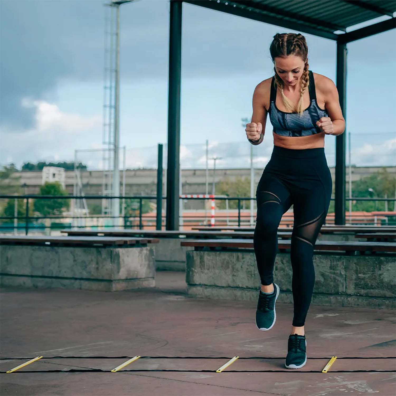 A Escada de Agilidade é um acessório de treinamento composto por tiras e degraus ajustáveis posicionados no chão para exercícios de deslocamento.
